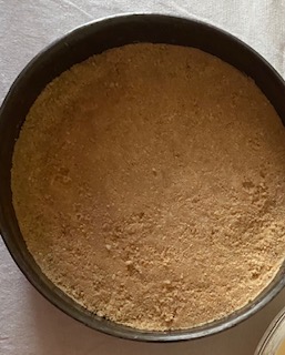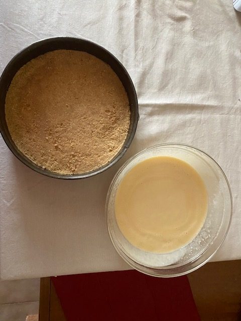 Fate fondere il burro, tritate finemente i biscotti foderate di carta da forno una tortiera da 20 cm di diametro con carta da forno. Mescolate i biscotti tritati con il burro fuso e distribuite il composto sul fondo della tortiera. Mettete la tortiera in frigorifero a raffreddarsi per almeno mezz'ora e nel frattempo preparate la farcitura.