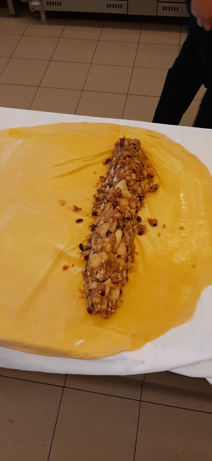 Quando l'impasto è pronto lo prendiamo e lo appoggiamo su una spinatoia con sopra un coprimacchia bianco, dividiamo in due l'impasto e con il mattarello lo stendiamo, deve diventare molto sottile come un foglio, se ci sono zone spesse le stendiamo con le mani, quando abbiamo steso l'impasto con l'aiuto del pennello ci mettiamo il burro fuso per metà impasto poi ci aggiungiamo il nostro composto di mele, uvetta, pinoli e cannella, grazie all'aiuto del coprimacchia lo rotoliamo e man mano ci aggiungiamo il burro per far attaccare l'impasto, quando lo abbiamo arrotolato lo mettiamo dentro a un vassoio di metallo con la carta da forno e sopra ci aggiungiamo il burro fuso.