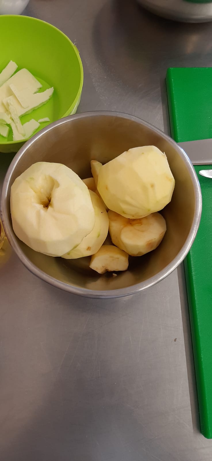 Prendiamo le nostre 5 mele e le laviamo, quando le abbiamo lavate le mettiamo dentro a un contenitore intanto prendiamo un coltello trinciante e le sbucciamo e gli togliamo il torsolo poi quando abbiamo abbiamo finito prendiamo un altro contenitore dove metteremo le fette di mele, quindi mettiamo la mela sul tagliere, la tagliamo a metà e poi a fette, tagliamo la mela a fette perché permette che quando lo metteremo nell'impasto non cadranno ma resteranno belli compatti all'interno, dopo aver tagliato la mela, il contenitore lo riempiamo di acqua fredda con l'aceto oppure del limone.