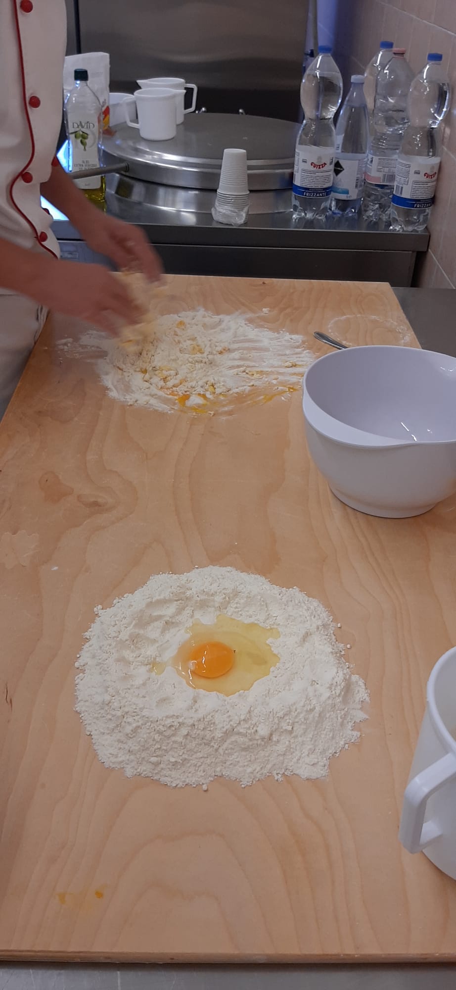 Prima di tutto misuriamo tutti gli ingredienti quando abbiamo misurato prendiamo una spianatoia di legno e ci aggiungiamo la farina, facciamo una fontana e ci aggiungiamo le uova, il burro sciolto, l'olio e l'acqua e mescoliamo, l'impasto deve diventare bello liscio, quando abbiamo fatto l'impasto lo mettiamo nella pellicola e lo facciamo riposare in frigo.