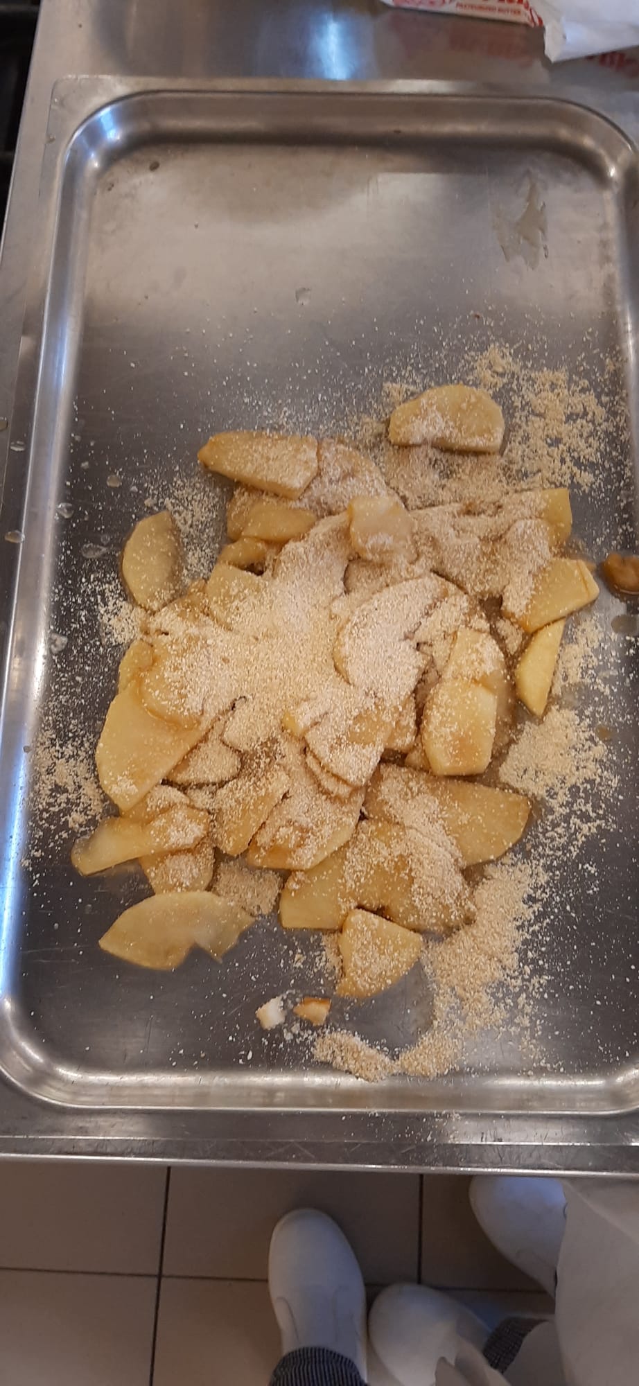 Intanto prendiamo un padella nera di ferro e ci aggiungiamo lo zucchero e il burro e intanto ci aggiungiamo man mano le fette di mela con l'uvetta e i pinoli, le facciamo caramellare e quando saranno pronte le versiamo dentro a un vassoio di metallo e sopra ci aggiungiamo del pangrattato per far assorbire l'acqua quando abbiamo finito di cuocere le mele le mescoliamo con le mani aggiungendo la cannella in polvere.
